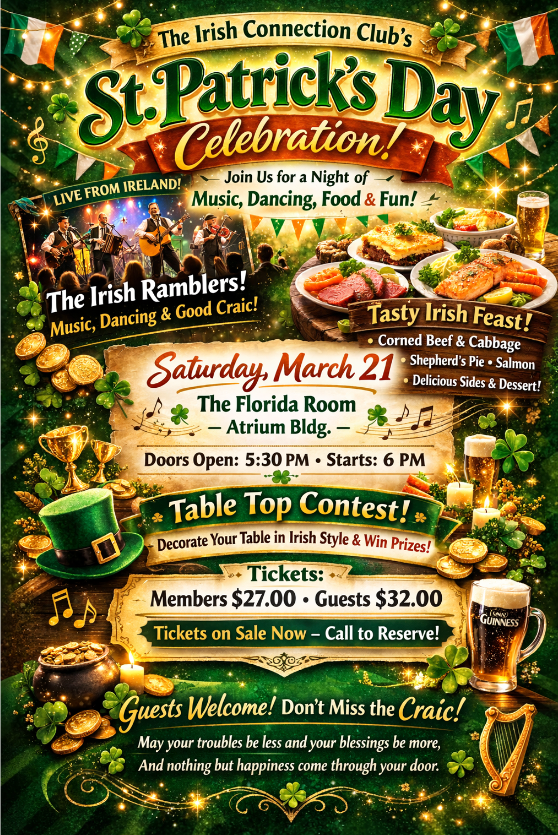 - IRISH CONNECTION MONTHLY LARGE GROUP EVENTS are held on the third Friday of the month, October thru April (except for March), in the Florida Room beginning at 6:00 p.m. These events are social and open to members of the Irish Connection and their guests.
